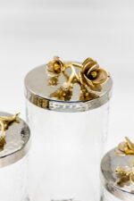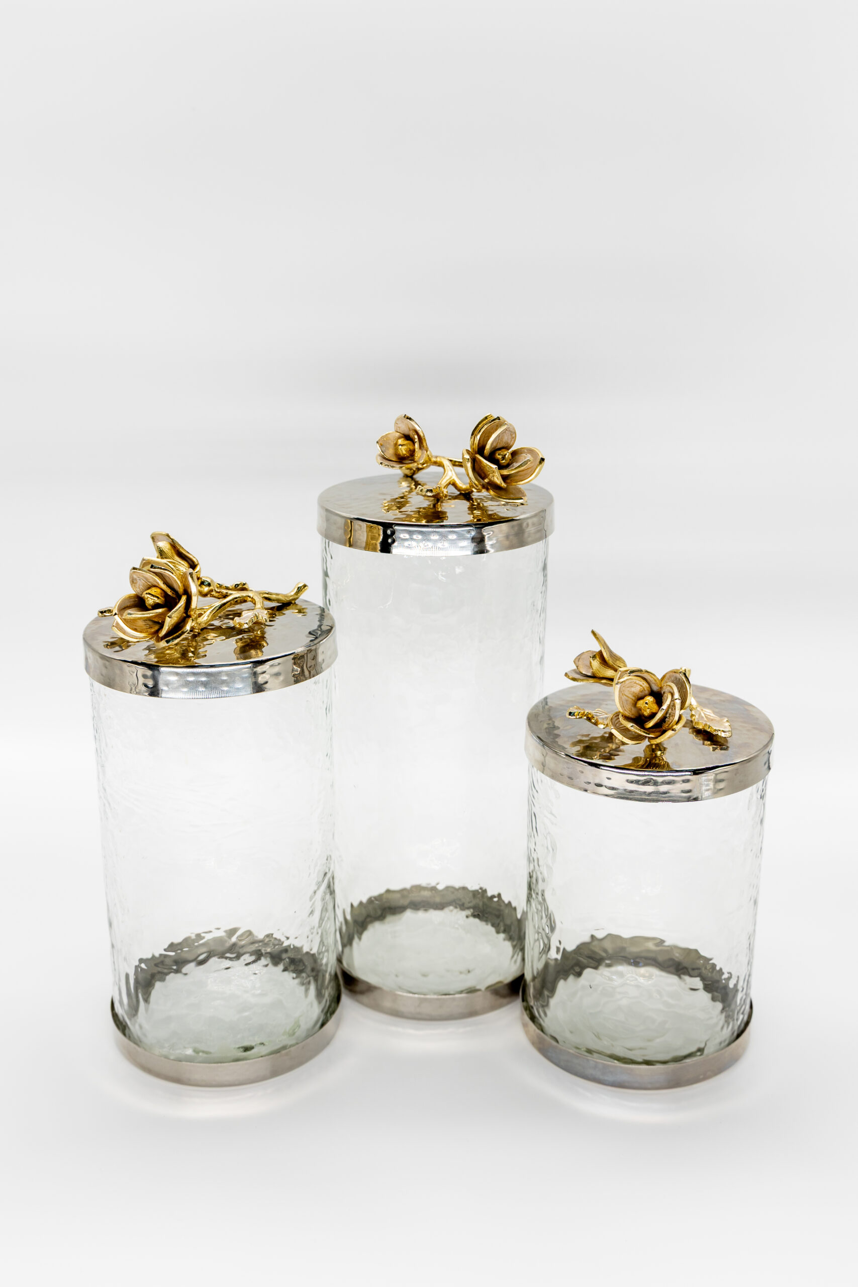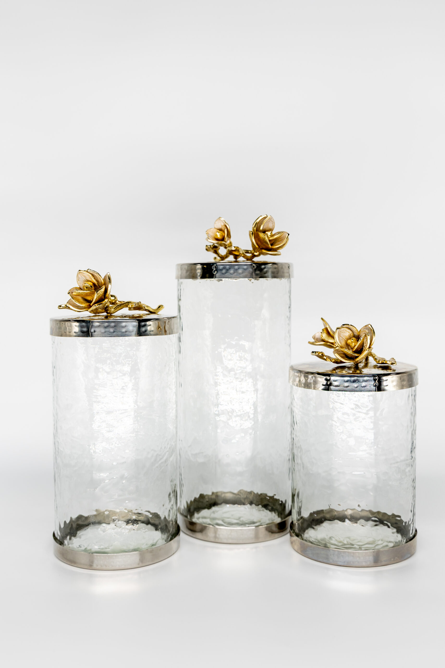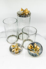 Infuse your home with timeless sophistication through our beautifully crafted hammered effect glass and stainless steel canister, elegantly adorned with intricate brass floral accents. Designed to captivate, this piece seamlessly blends function and style perfect for elevating your kitchen decor, serving as a striking centerpiece, or offering graceful storage for non-perishable items. A true statement piece that adds an exclusive, artistic charm to any space.