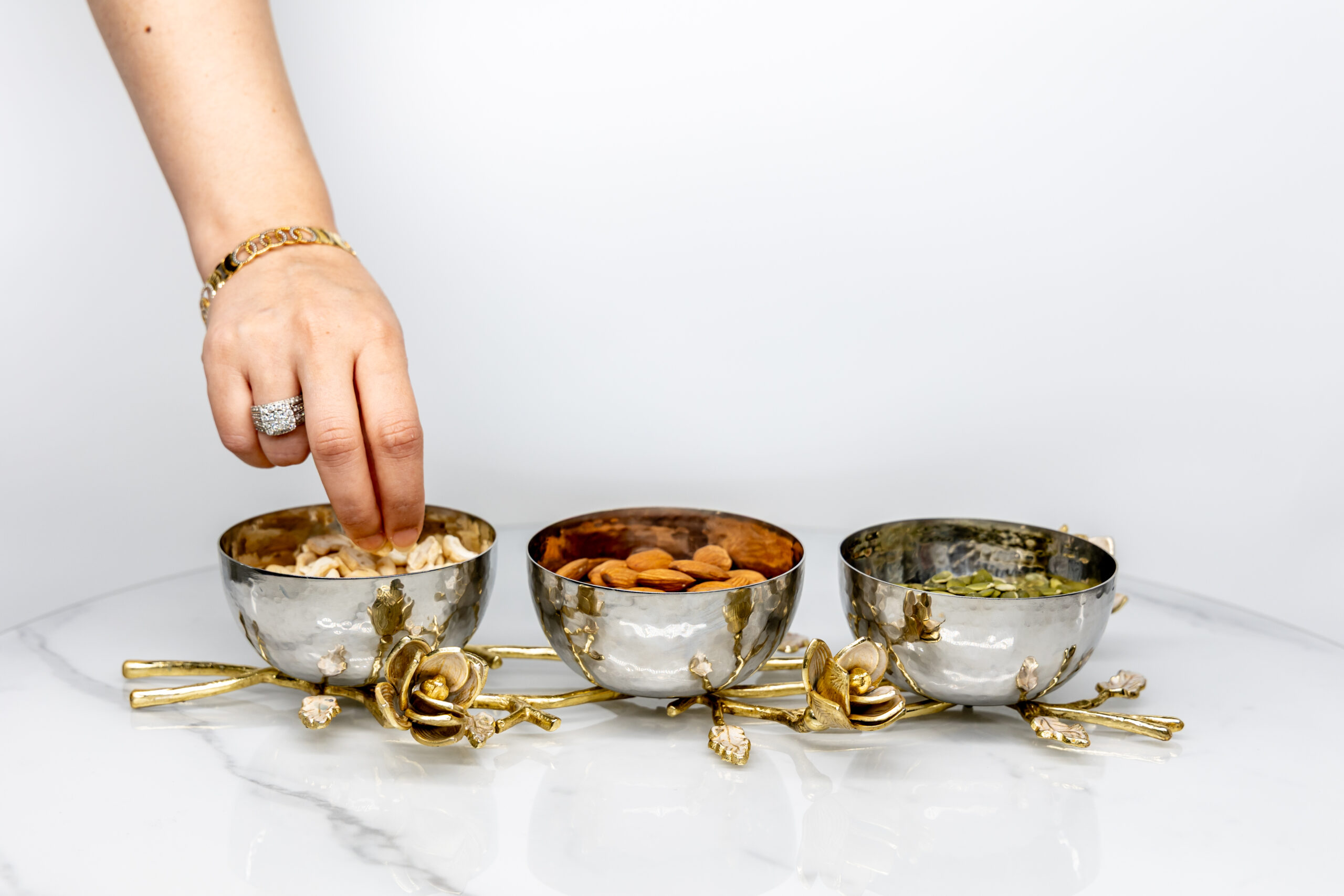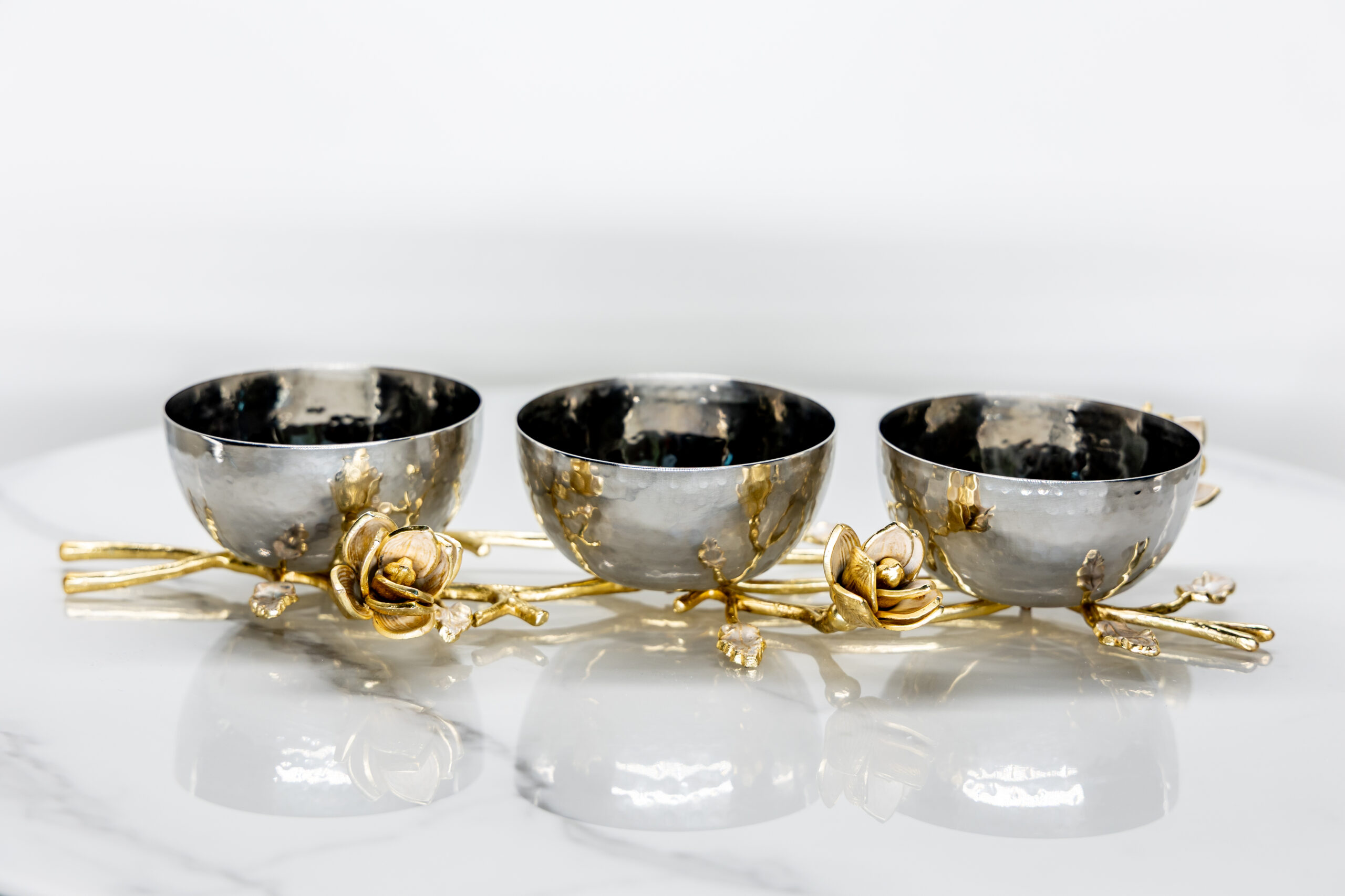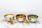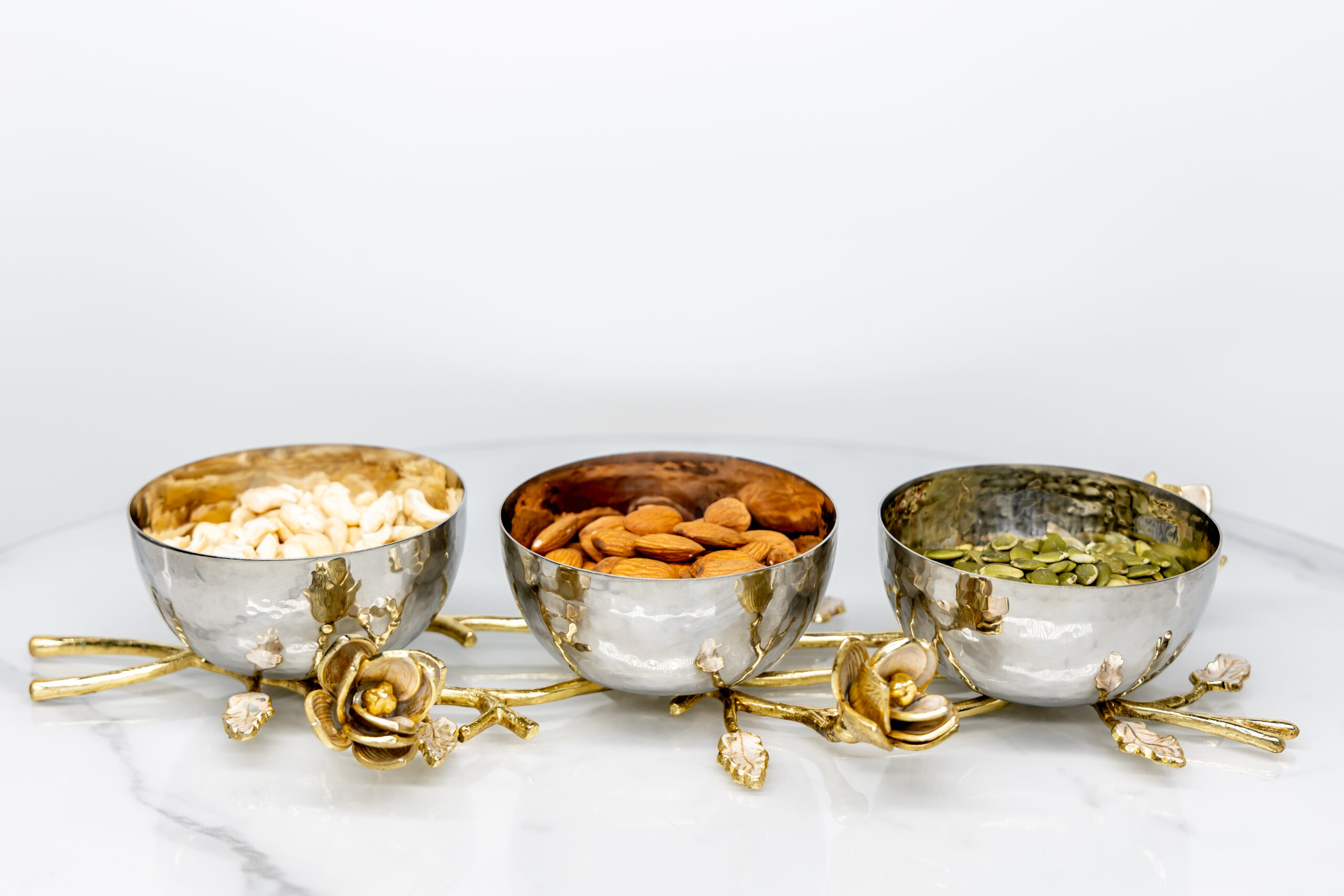 Upgrade your dining and hosting experience with this premium 3 piece stainless steel bowl set securely mounted on an ornate brass vine base with handcrafted floral detailing. The rich golden tones and sculpted design turn this piece into more than serveware it’s a functional centerpiece. Ideal for serving snacks, fruits, condiments, or side dishes, this decorative bowl set adds a luxurious touch to your kitchen, dining table, or buffet spread.